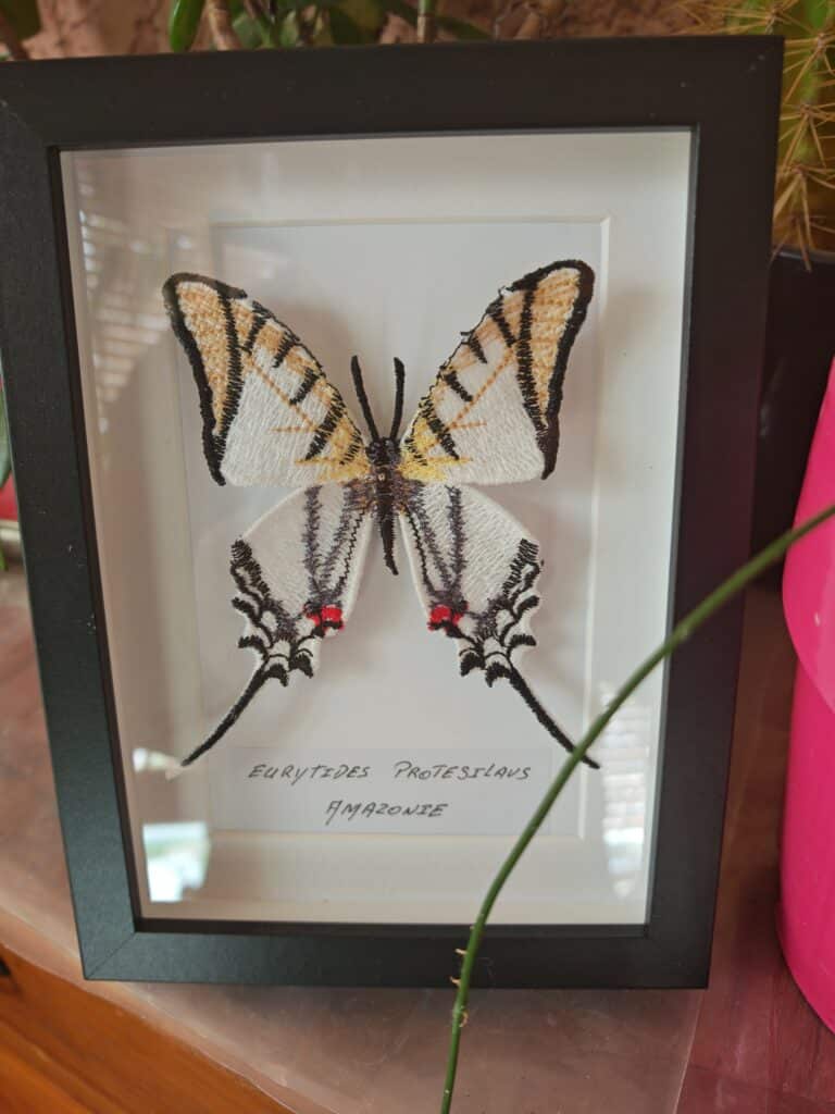 Inspirée par la majesté du Eurytides Protesilaus, ce papillon emblématique d’Amazonie, cette œuvre allie la précision du geste artisanal à la beauté du monde sauvage.