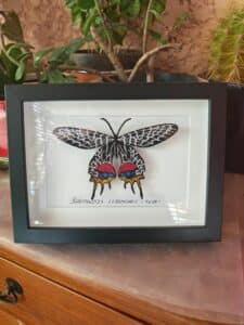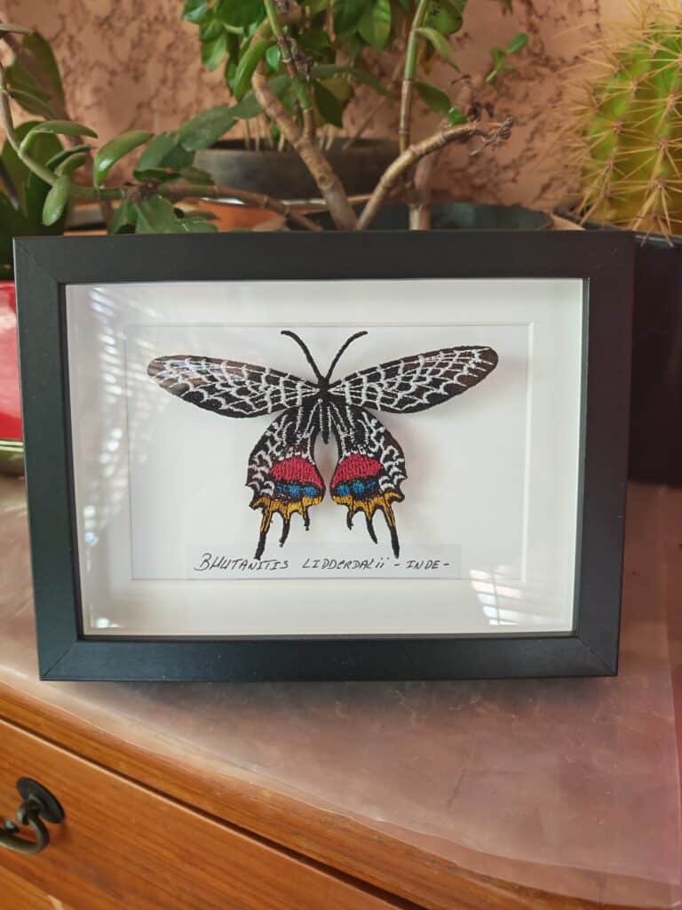 Sublimez votre décoration intérieure avec cette magnifique reproduction artisanale du célèbre Bhutan Glory (Bhutanitis lidderdalii). Ce n’est pas un spécimen naturalisé, mais une œuvre textile délicatement brodée, offrant une alternative éthique et durable pour les amoureux de l’entomologie.